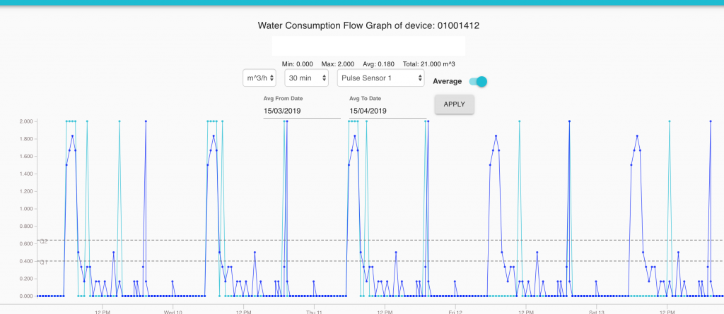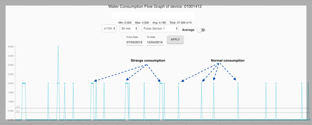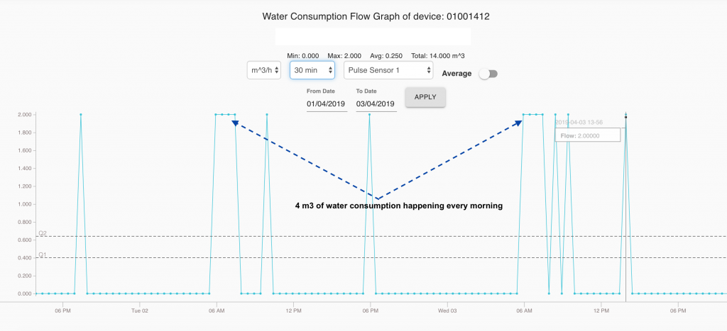 The graph above shows that on the 1th of April there was no issue but on 2th and 3th 4m3 of water have been consumed. The system immediately signaled the high consumption.