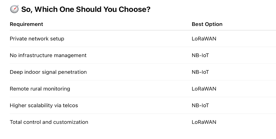 In the world of IoT and remote monitoring, choosing the right communication protocol can make or break your project. Two of the most popular LPWAN (Low Power Wide Area Network) technologies are LoRaWAN and NB-IoT — both powerful, but designed for different use cases.